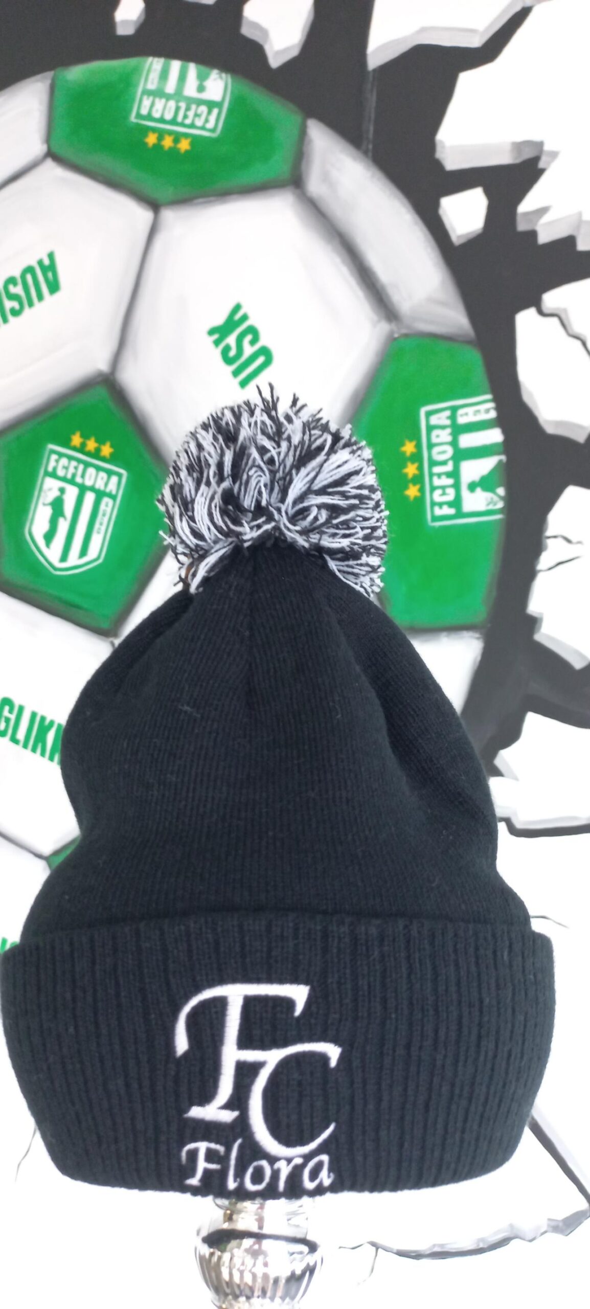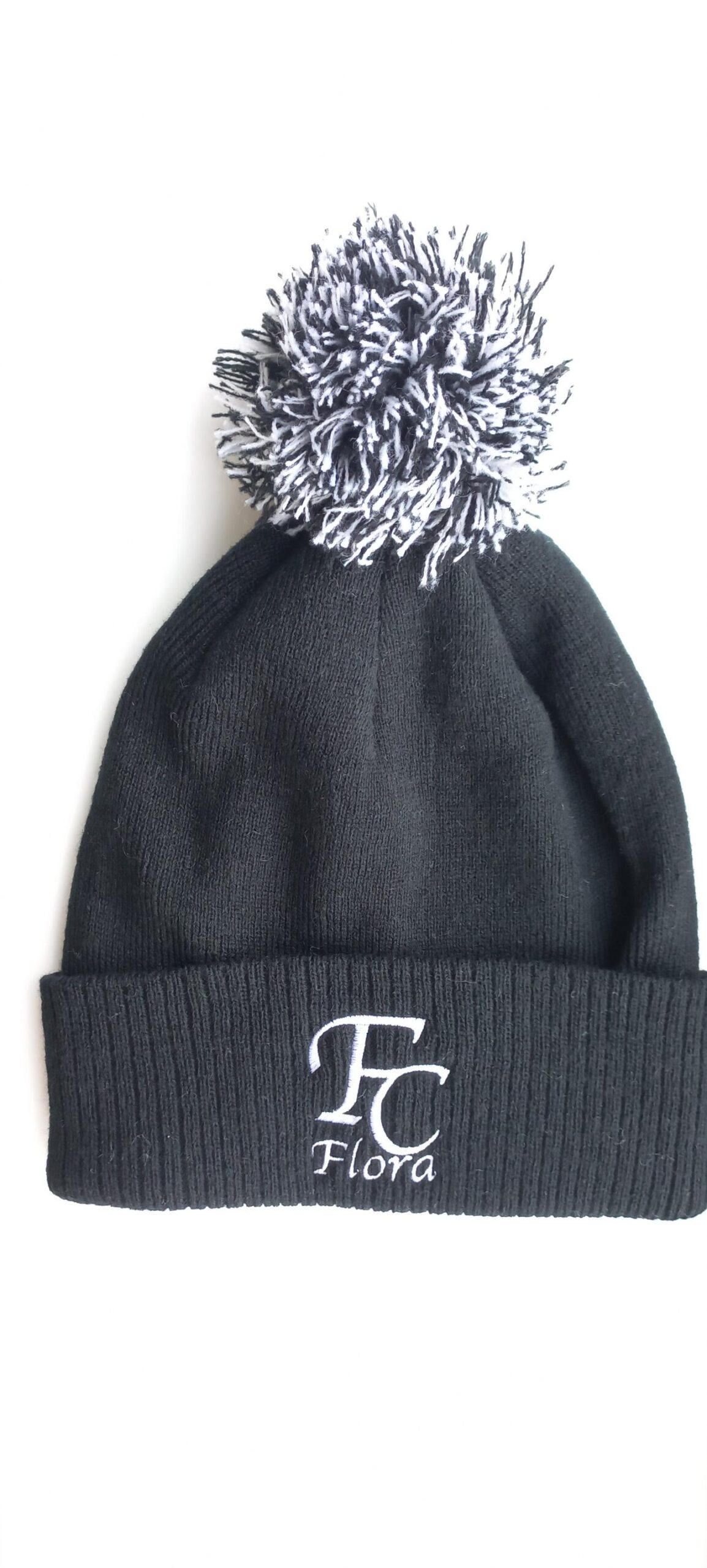 FC Flora black tassel hat is perfect for wearing in cold weather. The hat is made of a nice soft material and is very stretchy. Suitable for both children and adults. The hat has white FC Flora embroidery on the front.